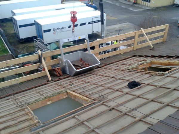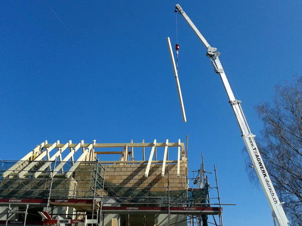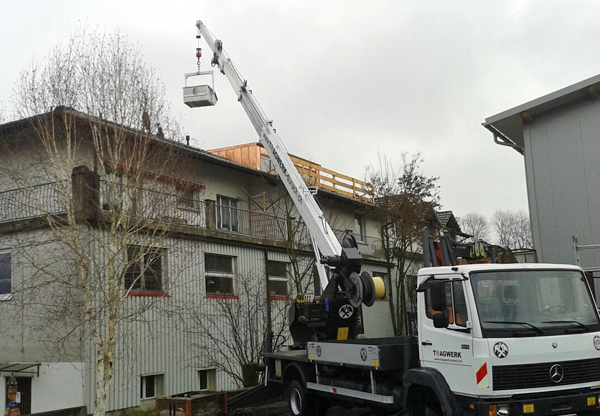 Unser Mobilkran ermöglicht nicht nur schnellere und somit kostengünstigere Ausführung der Zimmerer- und Dachdeckerarbeiten, sondern auch das Arbeiten in luftiger Höhe. Zur Hebebühne umgebaut erreicht er eine Höhe von 27 m.